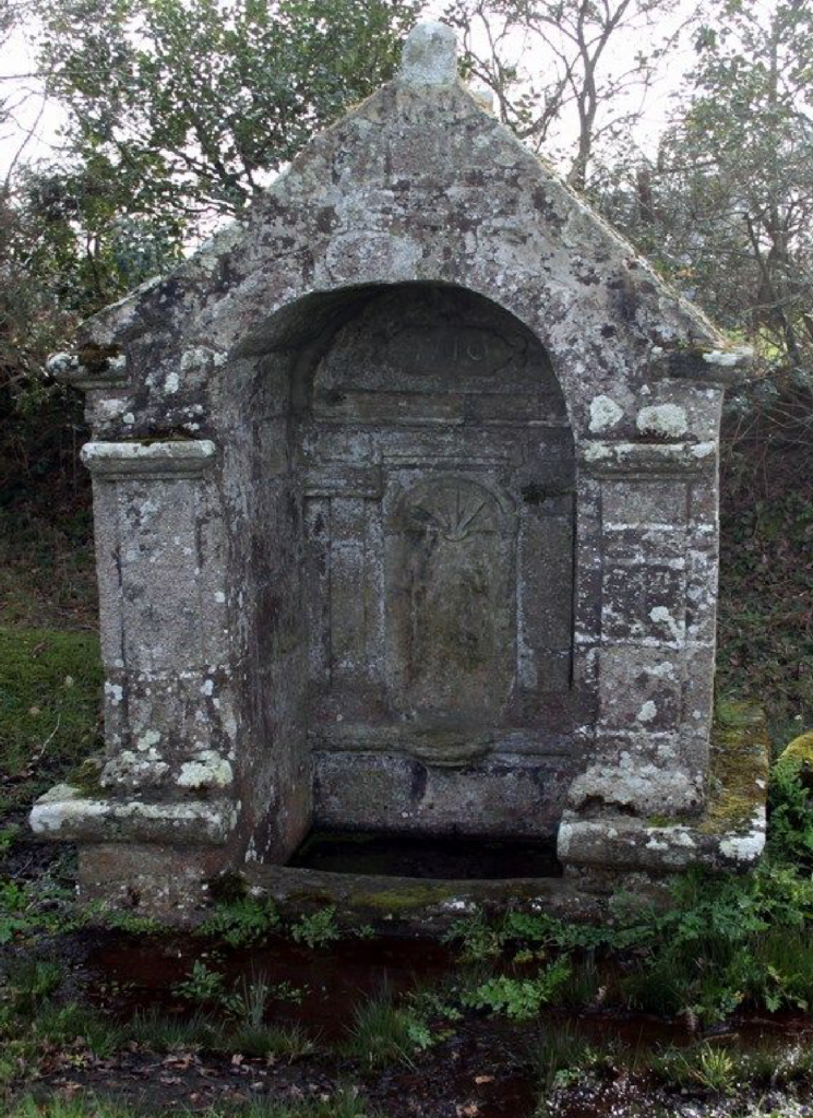 De l’ensemble des fontaines, c’est la plus remarquable. Élevée dans une enceinte semi-circulaire, elle montre une dalle creusée d’une niche, ornée de deux rangs de trois boules à la signification énigmatique. Sa construction doit être contemporaine de la reconstruction de la chapelle qu’elle accompagne. L‘eau de cette fontaine aurait le pouvoir de guérir les maux des yeux.
