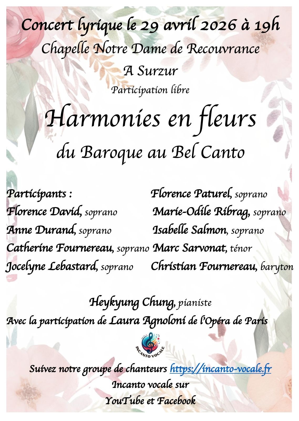 Incanto Vocale donnera un nouveau concert lyrique dans La Chapelle Notre dame de la Recouvrance le mercredi 29 avril à 19h, un voyage musical, à travers les siècles : « Harmonie, en fleurs du baroque, au Bel Canto ».