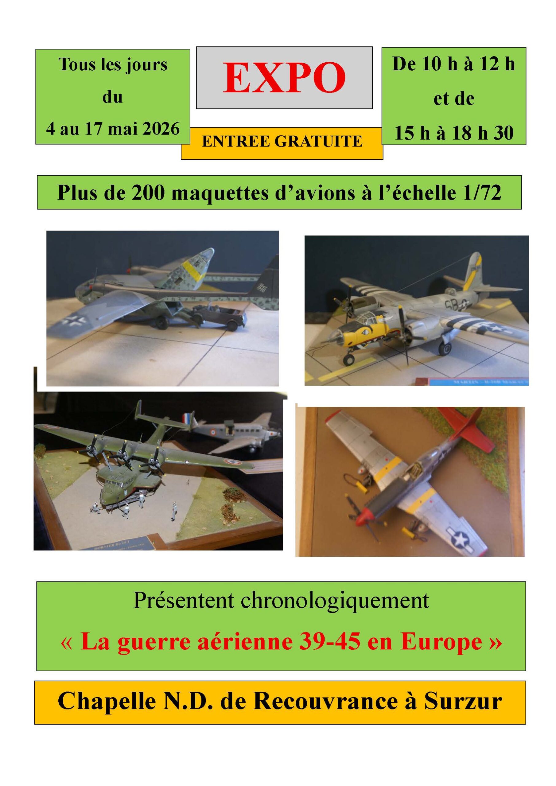 Comme chaque année, dans le cadre des commémorations du 8 mai 1945, Daniel PRIMA, expose plus de 200 maquettes d’avions à l’échelle 1/72° dans la chapelle N.D. de Recouvrance. Elles retracent les grandes phases de la guerre aérienne 39-45 en Europe.